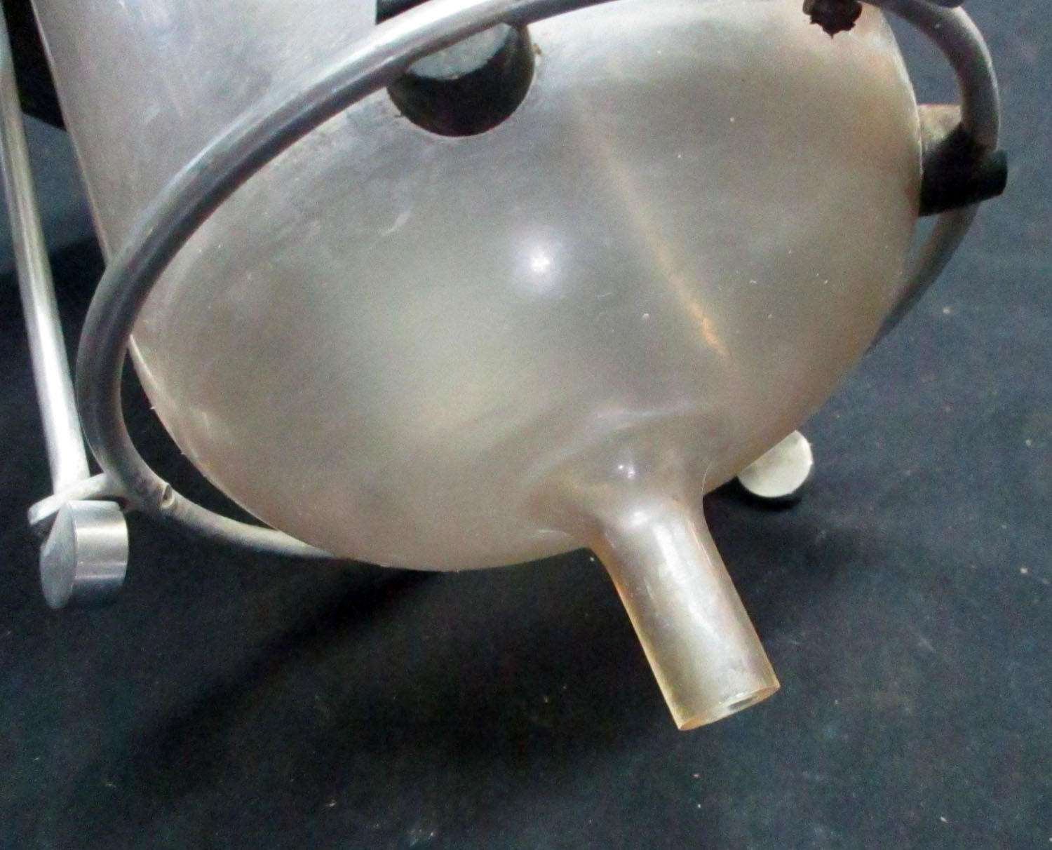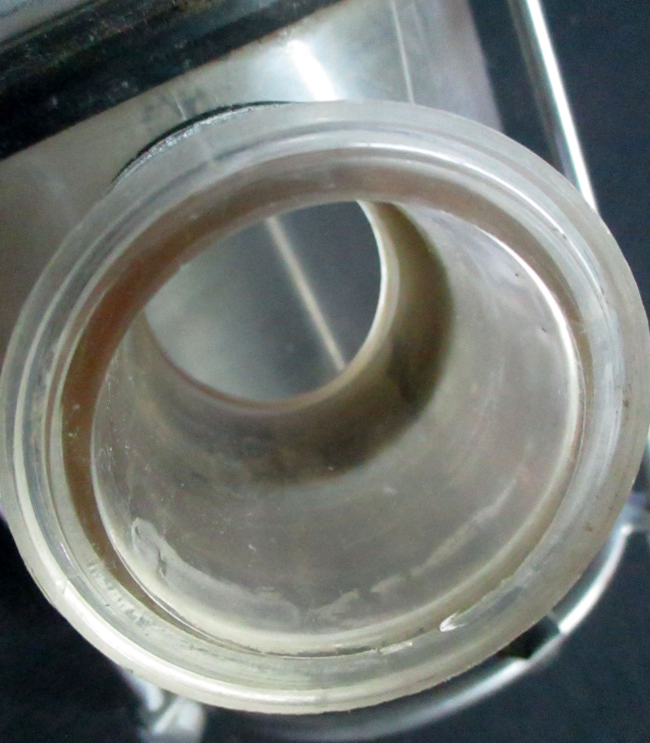 USED This used washer/releaser body is made of plastic and stainless steel. The unit is 12″ tall. The top has an outer diameter of 10″ and an inner diameter of 3 7/8″. The main body has a 5 1/2″ outer diameter. The side port is 2 7/8″ long with an outer diameter of 2 1/4″ and a inner diameter of 2″. The ferrule has a 2 3/8″ diameter groove and a 2 5/8″ outer diameter.