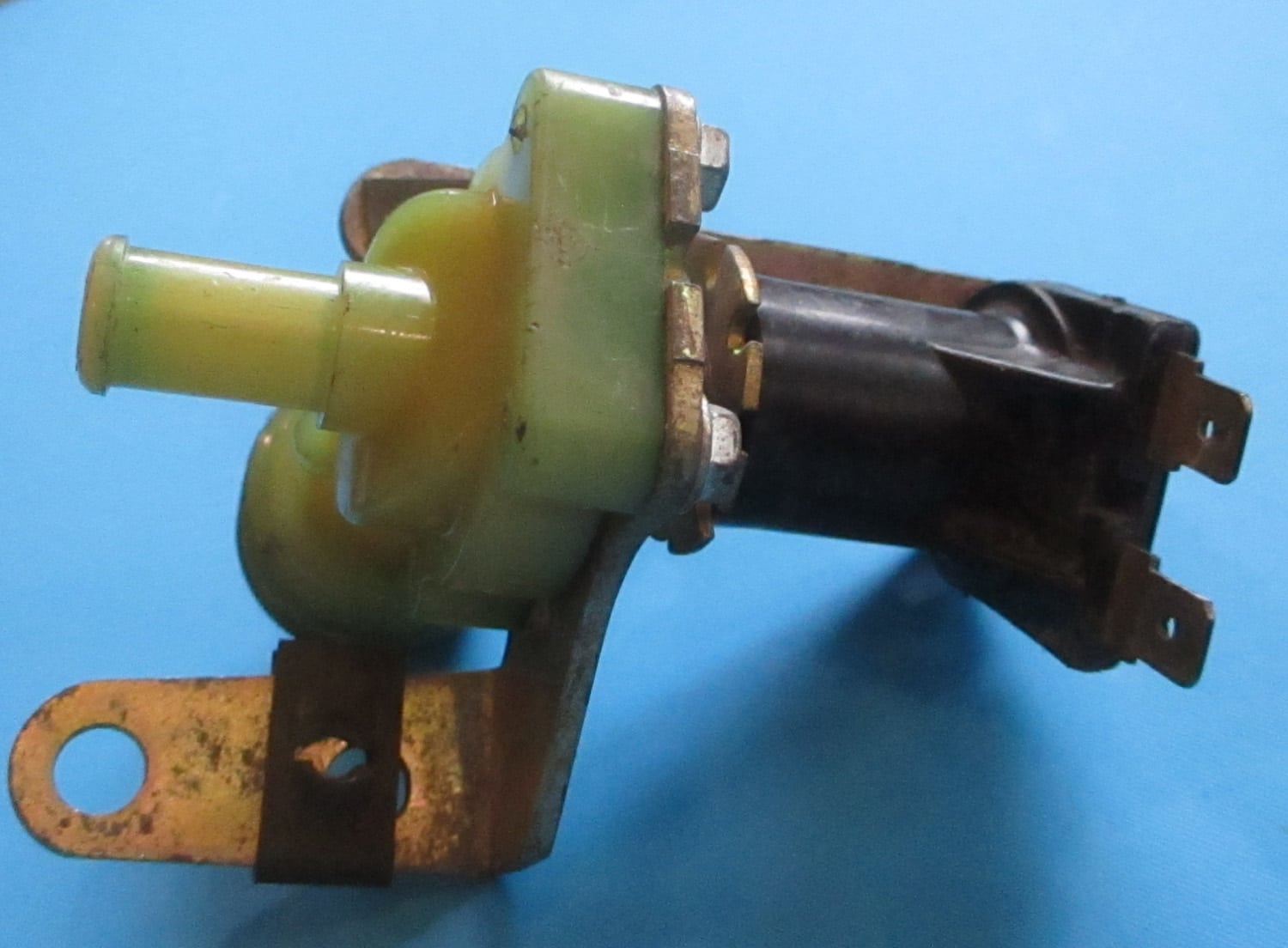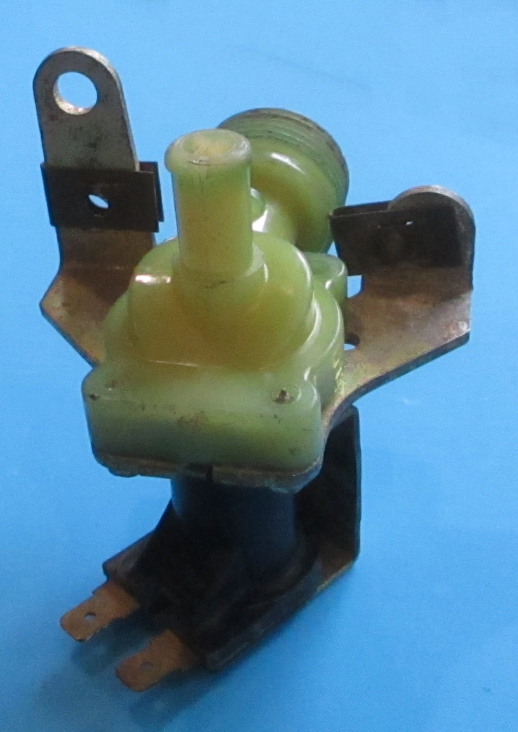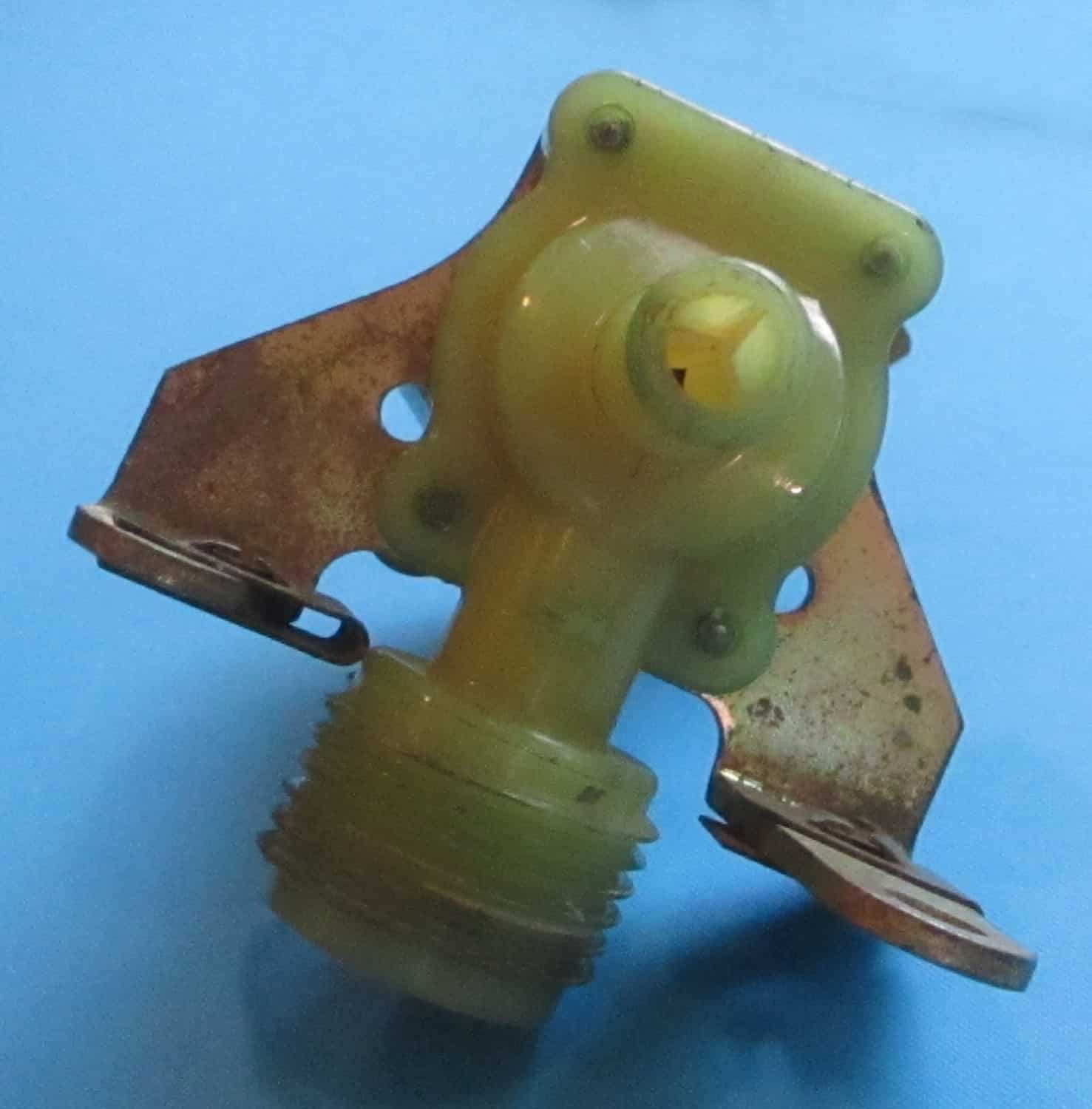 USED This single water valve is 2 3/4″ long, 2 11/16″ wide, and 3 5/16″ high. The threaded end is 3/4″ long with a 1-1/16″ outside diameter. The smaller tube is 1″ long with a 7/16″ outside diameter. The prongs are 1/4″ wide. Note that the coil has no voltage marking.