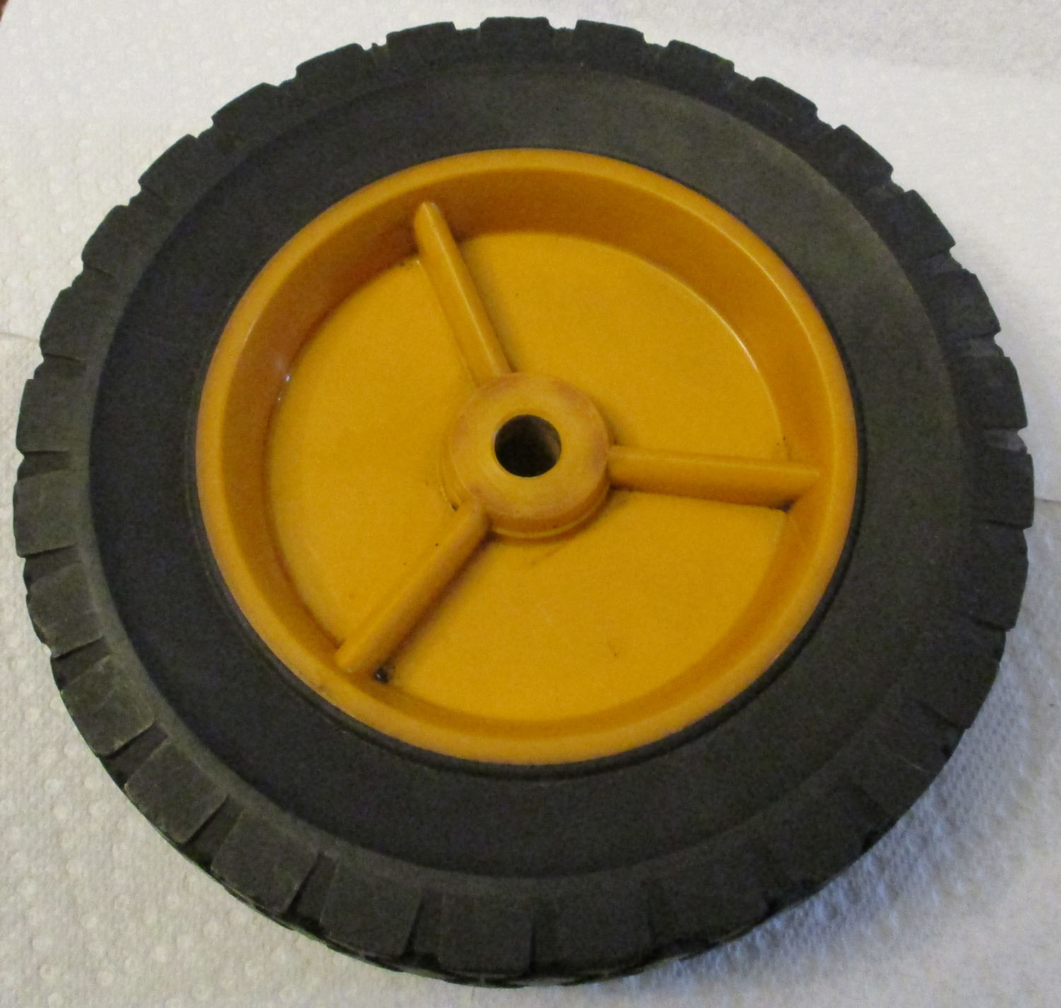 USED This rubber and plastic wheel has an outer diameter of 7 5/8″, an inner diameter of 1/2″, and is 3″ high overall. The manufacturer is unknown. There is a number on the wheel, 3035.