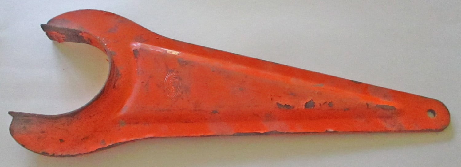USED This Surge metal wrench for a 2″ tank valve is 14″ long, 5 1/2″ wide, and the thickness goes from 1/8″ to 7/8″. The opening on the end is 3 1/8″.